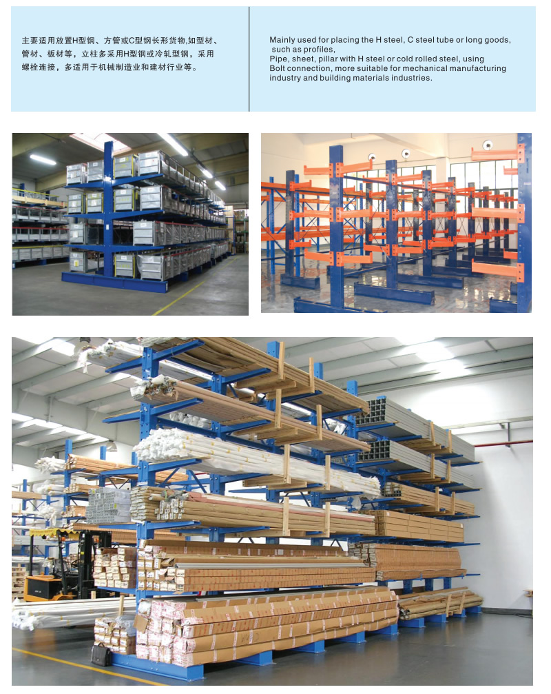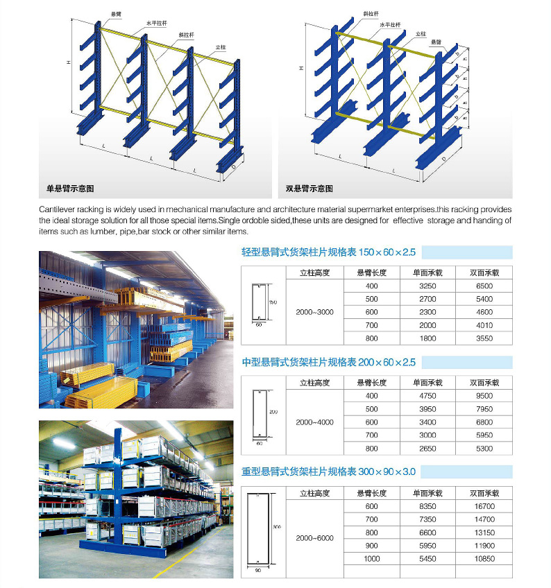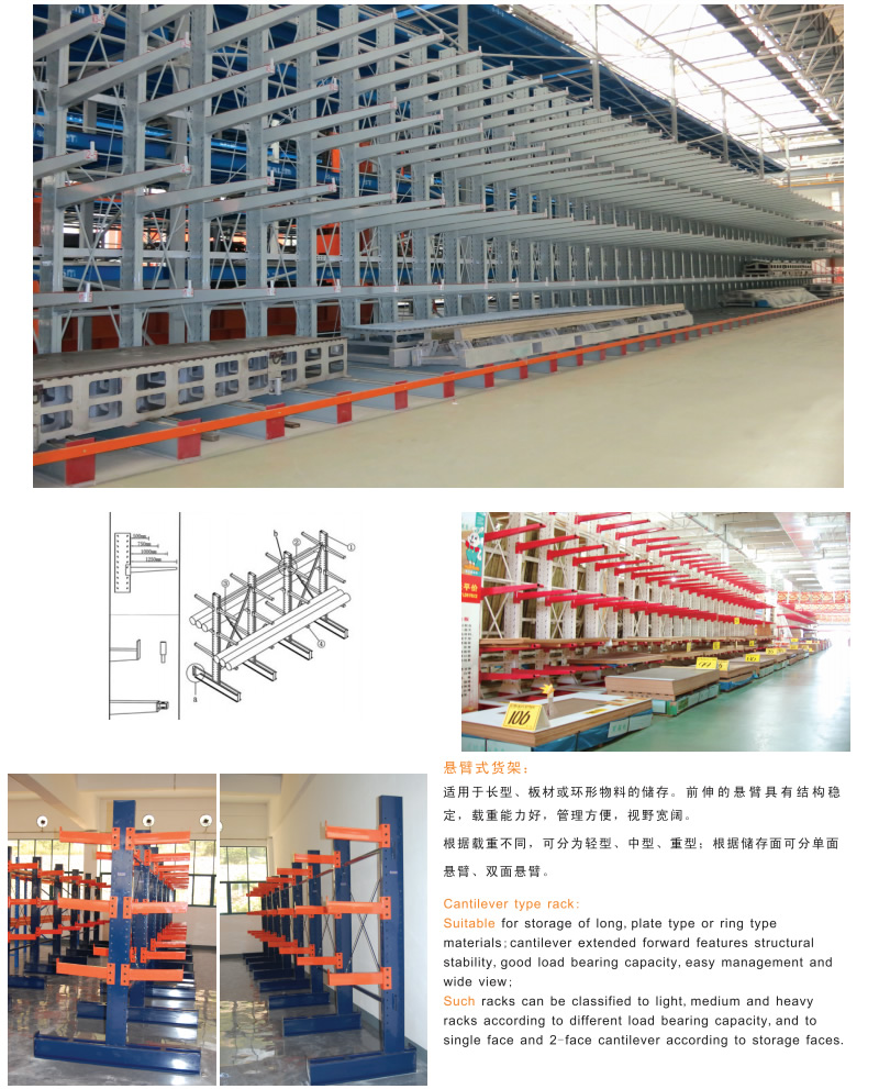 產(chǎn)品介紹: 懸臂式貨架適用于存放長物料、環(huán)形物料、板材、管材、及不規(guī)則貨物。懸臂可以是單面或雙面,懸臂式貨架具有結(jié)構(gòu)穩(wěn)定,載重能力好、空間利用率高等特點(diǎn)。懸臂式貨架立柱采用H型鋼或冷軋型鋼,懸臂采用方管、冷軋型鋼或H型鋼,懸臂與立柱間采用插接式或螺栓連接式,底座與立柱間采用螺栓連接式,底座采用冷軋型剛或H型鋼。