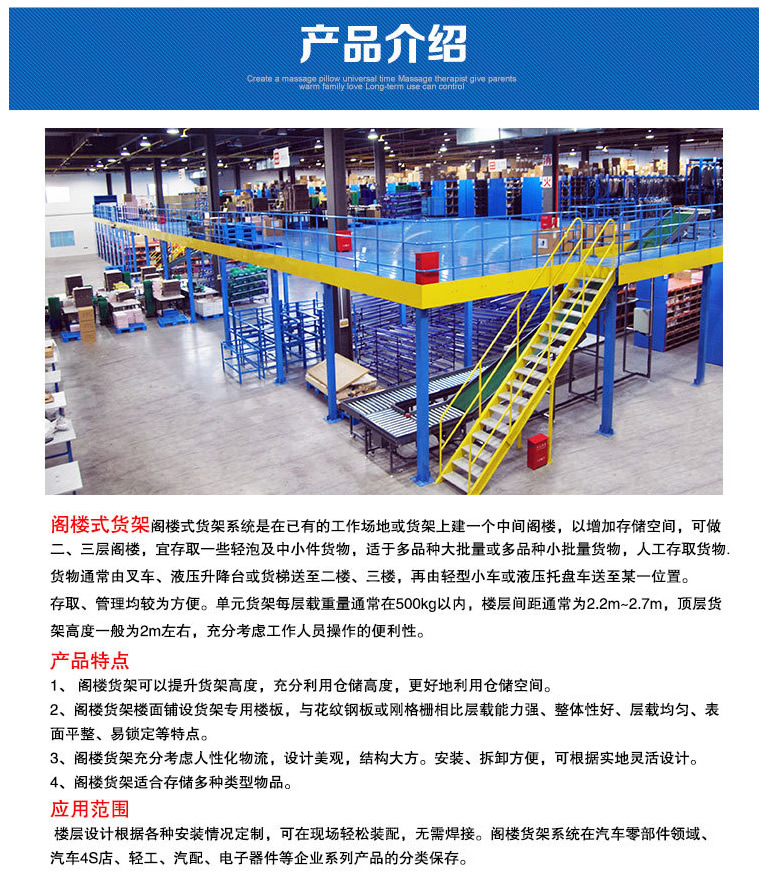 3、閣樓貨架充分考慮人性化物流,設(shè)計(jì)美觀,結(jié)構(gòu)大方。安裝、拆卸方便,可根據(jù)實(shí)地靈活設(shè)計(jì)。